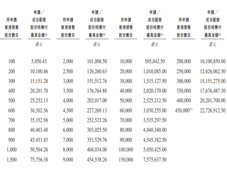 乙组门槛为10万股,申购所需资金约505.04万港元。