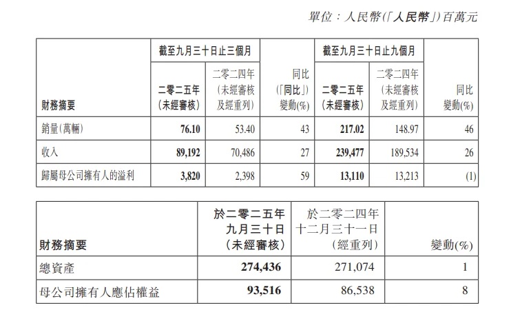 第三季度燃油车与新能源车销量实现同步增长,推动总销量实现快速增长43%。
