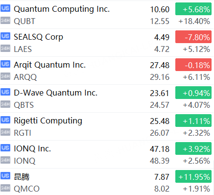 11月17日,美股夜盘时段,量子计算概念股上涨, Quantum Computing Inc.涨超18%,Arqit QuantumInc.涨超6%,SEALSQ Corp涨超5%,D-Wave Quantum Inc.涨超4%,IONQ Inc.Rigetti Computing涨超2%,昆腾涨近2%。