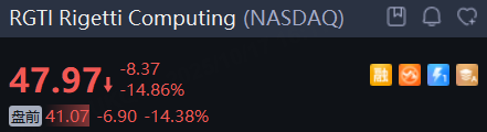 量子计算概念股延续跌幅, Rigetti Computing 大跌14%,QBTS、IONQ跌超7%,QUBT跌超5%。