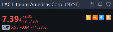 Lithium Americas Corp. 盘前续跌超11%,周四大跌超21.7%。摩根大通将该公司的评级从“中性”下调至“减持”,目标价为5美元,认为该股估值已显著偏高。