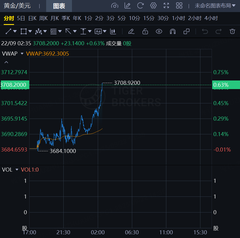 9月22日,港股黄金股涨幅持续扩大,$山东黄金(01787$、灵宝黄金潼关黄金涨超6%,赤峰黄金招金矿业涨超5%;现货黄金短线涨幅扩大至10美元,将纪录高位刷新至3715美元/盎司。
