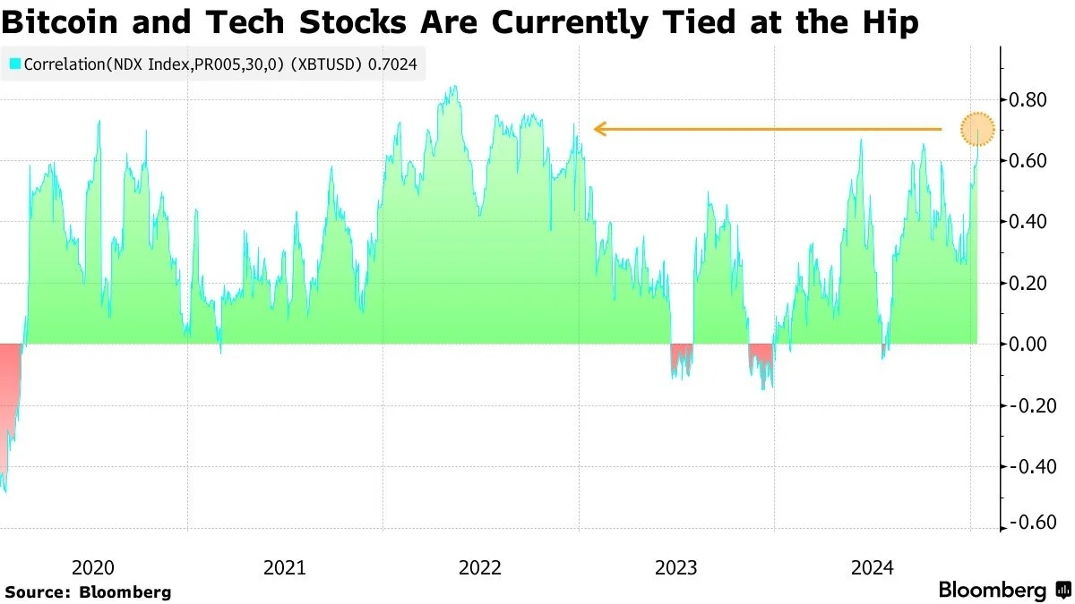 数据显示,目前比特币与纳斯达克100指数的30天相关系数约为0.7,显示出两者走势的高度关联性。(相关系数为1表示资产走势一致,负1则表示资产走势相反)