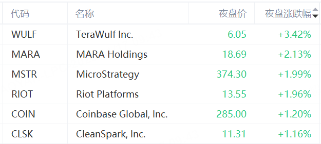本周五(1月17日)美股夜盘时段,比特币再度站上10.1万美元,概念股普涨, TeraWulf Inc. 涨超3%, MARA Holdings 涨超2%, MicroStrategy 、 Riot Platforms 涨近2%: