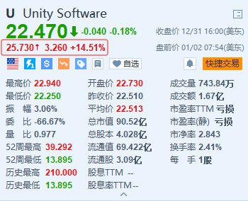 格隆汇1月2日|Unity Software(U.US)盘前涨超14.5%,报25.73美元。消息面上,有“美股散户带头大哥”称号的Keith Gill(网名为“咆哮小猫”)在社交平台X上发布了一张已故音乐家Rick James的GIF动图,后者以其单曲《Unity》而闻名。