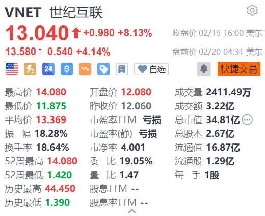 格隆汇2月20日|世纪互联(VNET.US)盘前涨4.14%报13.58美元。高盛曾发研报指,相信由于绿色电力接入降低电价,以及世纪互联在交付能力方面的良好记录,其新建的批发园区可以占据中国人工智能需求的份额,预计公司EBITDA 在2024至2026财年将加速增长,预计分别按年上升12%、17%及22%,推动股权价值复合增长。高盛将世纪互联美股目标价定于12.1美元,给予“买入”评级。