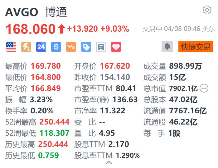 博通(AVGO.US)涨超9%,报168.06美元。消息面上,博通公布一项截至2025年12月31日的高达100亿美元的股票回购计划。该公司表示,回购可能通过多种方式进行,包括公开市场或私下谈判购买。(格隆汇)