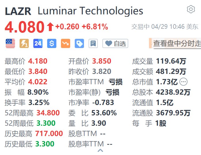 激光雷达传感器制造商Luminar Technologies(LAZR.US)涨超6.8%,报4.08美元。消息面上,Luminar首席执行官表示,公司与梅赛德斯-奔驰签署了一项新协议,开发并集成其最新激光雷达产品。(格隆汇)