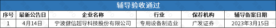 4月12日-5月2日,有1家公司境内(沪深两市)发行上市辅导验收通过。