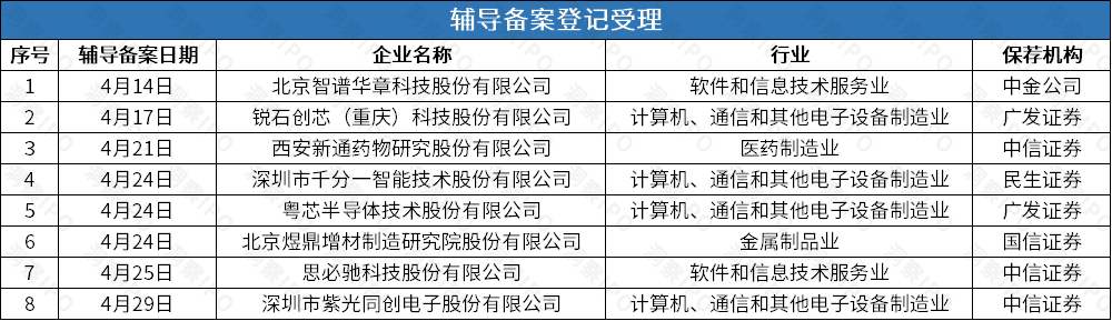 4月12日-5月2日,有8家公司境内(沪深两市)发行上市辅导备案登记获受理。