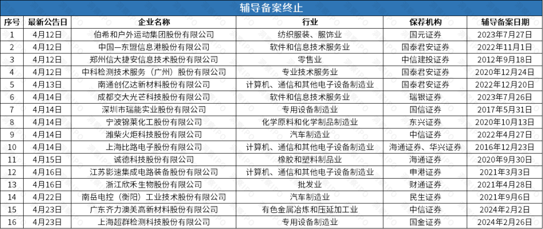 4月12日-5月2日,有16公司境内(沪深两市)发行上市辅导备案终止。