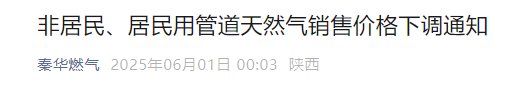 按照西安市发展和改革委员会《关于下调西安市非居民用管道天然气销售价格的通知》(市发改价格【2025】6号)、《关于下调西安市居民用管道天然气销售价格的通知》(市发改价格【2025】7号)文件规定,自2025年6月1日起,秦华集团非居民、居民用管道天然气销售价格调整如下:
