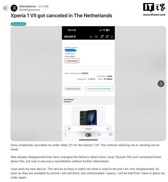 目前,这类投诉遍布欧洲多国家,涉及荷兰、德国、英国、法国等市场,但索尼官方尚未就此事发表任何说明,这也使得用户只能自行猜测原因,部分用户认为可能是索尼商品系统出错,也有可能是该公司低估了Xperia 1 VII的市场需求,从而导致产能 / 库存跟不上,因此选择砍单。