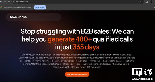 IT之家参考报道获悉,以山寨Novaleads平台为例,虽然实际上原 Novaleads 公司主营“客户关系管理服务”软件,并未涉足 AI,但黑客自行捏着了一个名为“Novaleads AI”的虚假品牌,并注册相应域名、架设官网,分发所谓 AI软件,但相应软件实为勒索木马,运行后会向受害者索要价值5万美元的数字货币作为赎金。