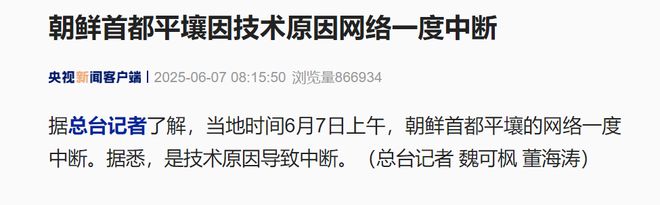 据总台记者了解,当地时间6月7日上午,朝鲜首都平壤的网络一度中断。据悉,是技术原因导致中断。