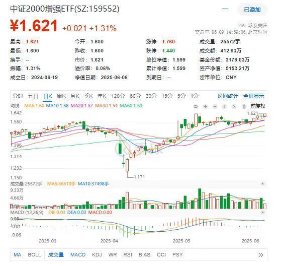 6月9日,小盘大放异彩,截至14时54分,$中证2000增强ETF(159552)涨1.25%再刷上市新高!近5日涨4.25%,近10日涨4.99%,近20日涨6.44%,今年以来累计涨24.33%。