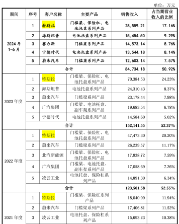 客户结构失衡,通常是损害财务健康的根源性因素。通过披露信息可知,2020-2023年1-6月,公司前五大客户营收占比始终超过50%,其中特斯拉自2021年起稳居第一大客户,贡献营收从1.8亿元攀升至7.04亿元,占整车厂商销售比例从32.9%跃升至49.31%。尽管2024年特斯拉订单下滑7.72%至6.50亿元,但其营收主导地位仍未改变。这种过度依赖单一客户的结构,使得友升股份在交易中丧失议价权,面对2021年上半年铝价17.63%的暴涨,销售单价仅能提升4.58%,被迫自行消化成本压力。
