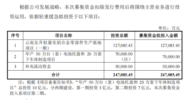在新能源汽车产业链加速重构的当下,友升股份携24.71亿元的IPO募资计划高调入场,凭借“云南轻量化铝合金零部件生产基地项目(一期)”以及“年产50万台(套)电池托盘和20万套下车体制造项目”等布局抢占产业升级先机,其中5亿元用于补充流动资金。