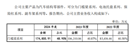 这一波动与产品结构的高度集中密切相关,门槛梁与电池托盘两大产品的收入占比从2021年的45.32%猛增至2024年的70.24%,由此形成产品集中化导致的价值侵蚀。而到了2024年,两大核心产品毛利率同步下滑,门槛梁降0.16个百分点至24.1%,电池托盘更是剧降4.97个百分点至18.3%。其中,电池托盘作为新能源汽车核心部件,正面临宁德时代等头部客户新建产能释放与价格战的双重冲击。