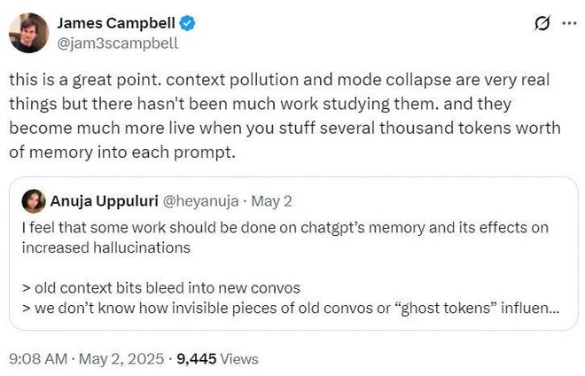 他赞同应该对 ChatGPT 的记忆及其导致更强幻觉的问题进行研究,并认为上下文污染和模式崩溃是真实存在的,但目前对它们的研究还不多。如果在每个 prompt 中塞入数千个 token 的记忆,它们便会变得更加活跃。