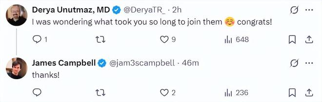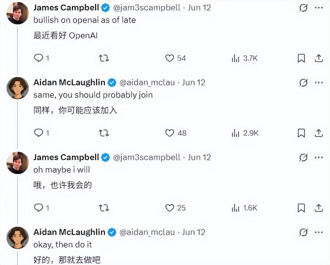 其实, James Campbell 的加入有迹可循。几天前,在 OpenAI 宣布组建模型行为研究团队的帖子下面,二者便开始了互动。