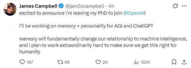 这位研究者名为 James Campbell,他才于 2024 年攻读 CMU 的计算机科学博士学位。现在,他突然宣布要放弃博士学业,加入 OpenAI。