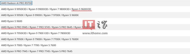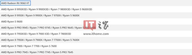 IT之家注意到,上述 CPU 不仅出现在适配 Radeon AI PRO R9700 工作站显卡的新版本驱动中,为 RX 9070 XT / RX 9070、RX 9060 XT 显卡提供支持的版本发行说明中也都有提到: