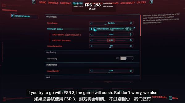尝试使用FSR 2.1性能模式时,帧率能够提升到20fps左右,但游戏会出现黑屏问题,而XeSS和FSR 3.1则几乎完全不支持,XeSS将游戏帧率降至1fps,而开启FSR 3.1则直接导致游戏崩溃。