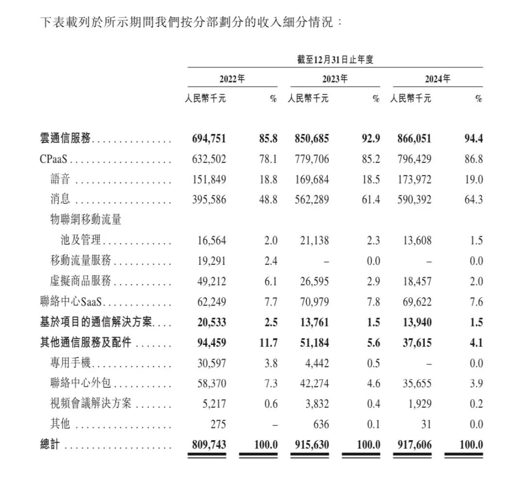 公司主要收入来自云通信服务,2024年占比94.4%,其他基于项目的通信解决方案、其他通信服务以及配件营收占比都很小。