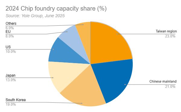 6月23日,Yole Group发布的《半导体晶圆代工行业现状报告》显示,到2030年中国大陆有望成为全球半导体晶圆代工产能领导者,预计将占据全球总装机产能的30%。2024年中国大陆以21%的全球代工产能份额位居第二,仅次于中国台湾(23%)。韩国以19%的份额排名第三,日本(13%)、美国(10%)和欧洲(8%)紧随其后。