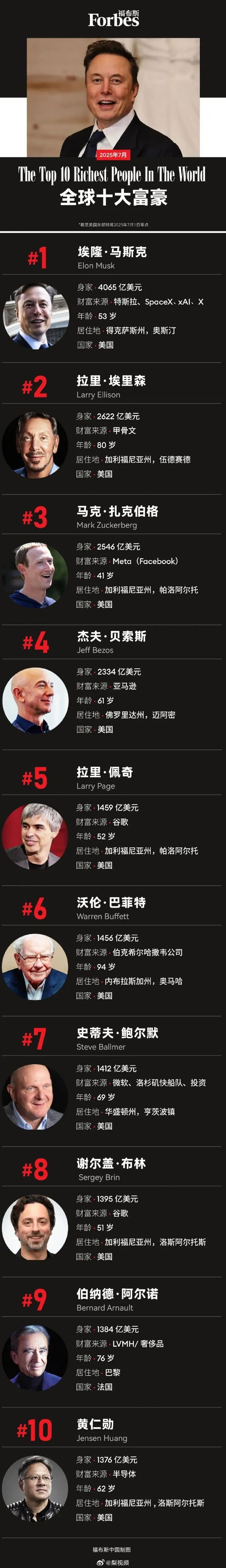 7月2日,福布斯公布了 2025 年 7 月全球十大富豪榜,其中第二名迎来新面孔。