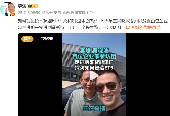 据了解,此次活动由知名财经作家、ET9 车主吴晓波及近百位企业家参加。吴晓波在参观中表示,新能源汽车为中国先进制造业“续命 10 年”,中国新能源汽车的发展,是一批新势力、有互联网思维的人掀起的浪潮。