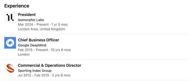 在成为Google DeepMind首席商务官前,他担任过首席软件工程师、高级产品经理、业务战略主管、商业与运营总监。