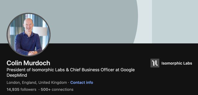 梳理发现,Colin Murdoch除了是Isomorphic Labs总裁外,还兼任Google DeepMind首席商务官。