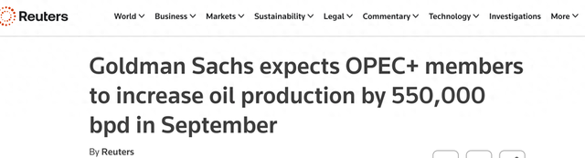 周日公布的这一预测是在OPEC+周六同意8月增产54.8万桶/日之后做出的。此次增产进一步加快了该组织在首次会议上的产出速度。高盛称:“周六宣布加快供应增量,这让我们更加确信,从去年夏天我们就开始关注到的这一转变仍在持续,即转向一种更长期的平衡状态,该状态聚焦于使闲置产能和市场占比正常化、维护内部团结,以及从战略上约束美国页岩油供应。”