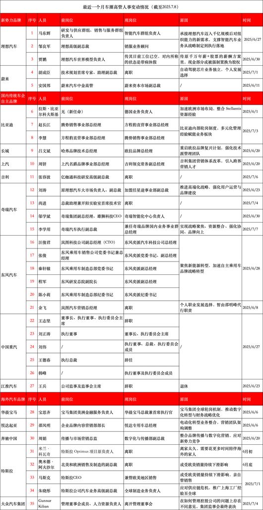 一个月超30位高管岗位调整,中国前6大自主车企集体换防。