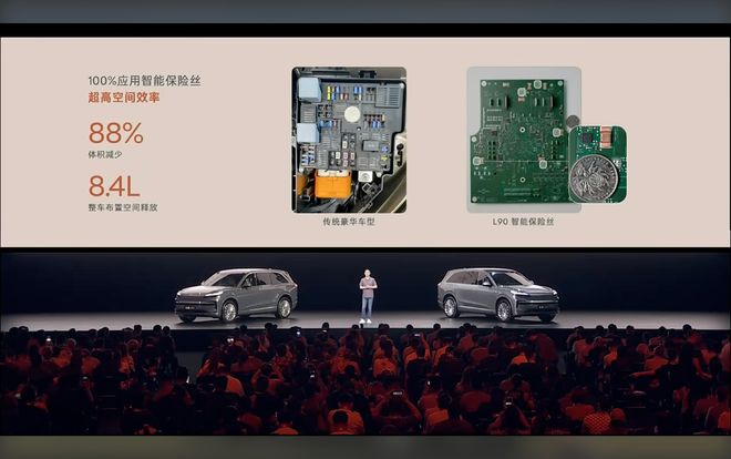 比如,乐道 L90 所搭载的驱动电机,其体积只有 37L,体积功率密度达到行业领先的 9.2kW/L;乐道 L90 直接采用了智能保险丝,相比传统豪车,其体积减小了 88%,而且还能智能断电。