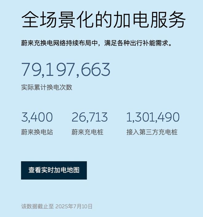 众所周知,蔚来是扩建补能体系最努力的车企。截至 2025 年 7 月 10 日,蔚来已经建设了 3400 座换电站,拥有 26713 个蔚来充电桩,更是接入超 130 万个第三方充电桩。