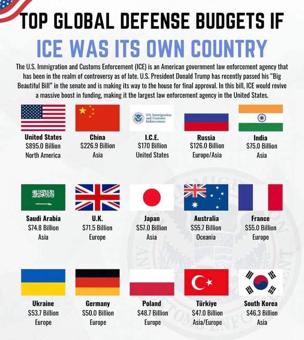 美国移民和海关执法局(ICE)的经费高达1700亿美元,为美国各个机构中资金最充裕的。这笔资金已经超过了俄罗斯军费。如果把ICE看作一支军队,其“军费”位列世界第三!