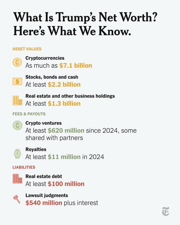 具体来看特朗普的财富构成:加密货币价值71亿美元,还有至少6.2亿美元加密货币行业的投资收益;股票、债券、现金合计22亿美元,房地产和其他生意13亿美元。负债方面,特朗普有1亿美元的房地产负债,以及5.4亿美元各类败诉赔偿。
