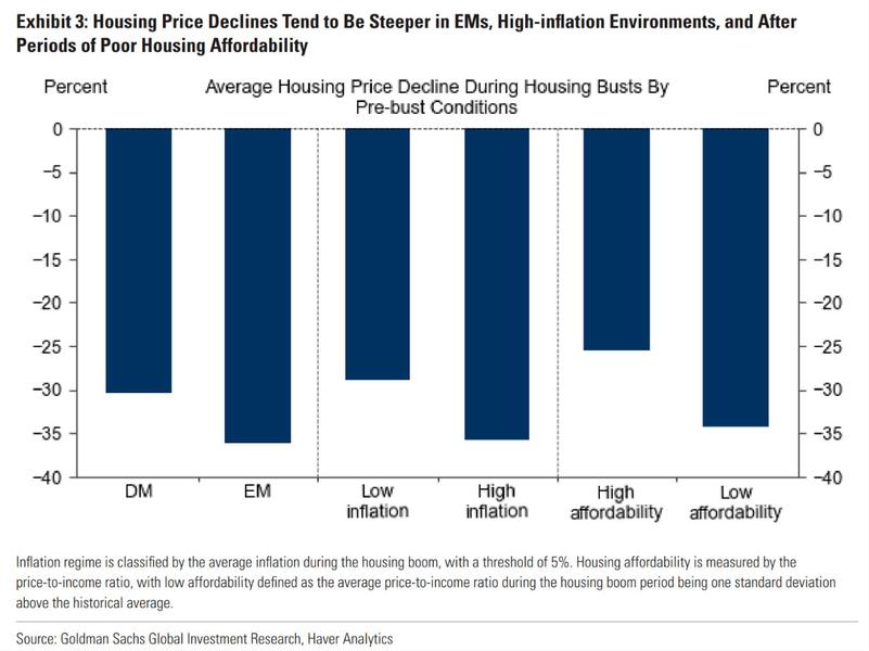 根据高盛对历史数据的总结,房地产市场大幅下挫的三个关键前置条件是:经济体为新兴市场(EM)、处于高通胀环境、经历了房价收入比过高的时期。这一分析框架对中国目前的房地产调整提供了复杂的信号:一方面,中国的通缩环境预示着房价调整可能较为温和;另一方面,极高的房价收入比意味着楼市可能面临更多下跌压力。