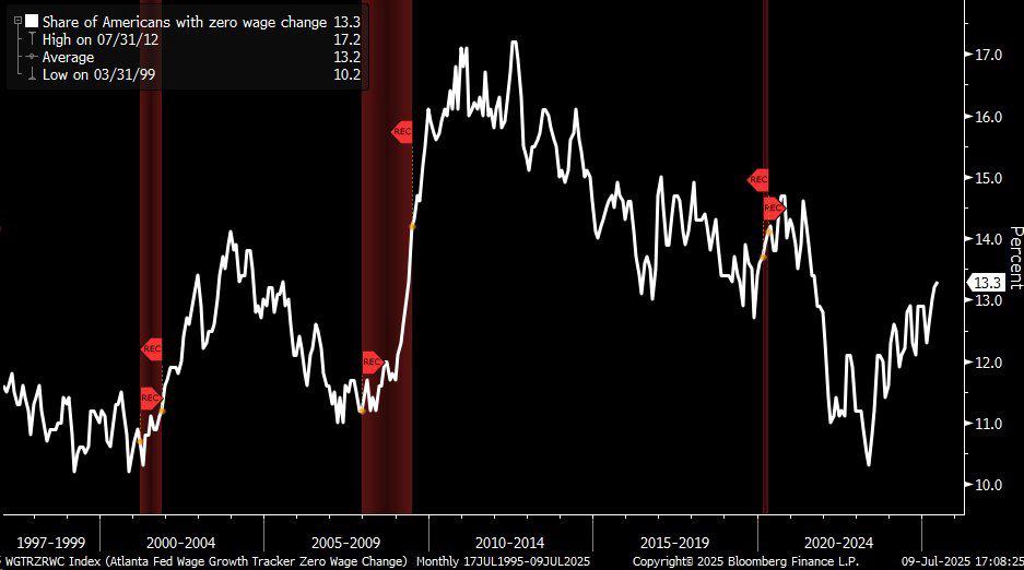 根据亚特兰大联储发布的数据,6月份没有获得任何加薪的劳动者比例跃升至13.3%,超过了长期均值,这是美国劳动力市场疲软的又一证据。