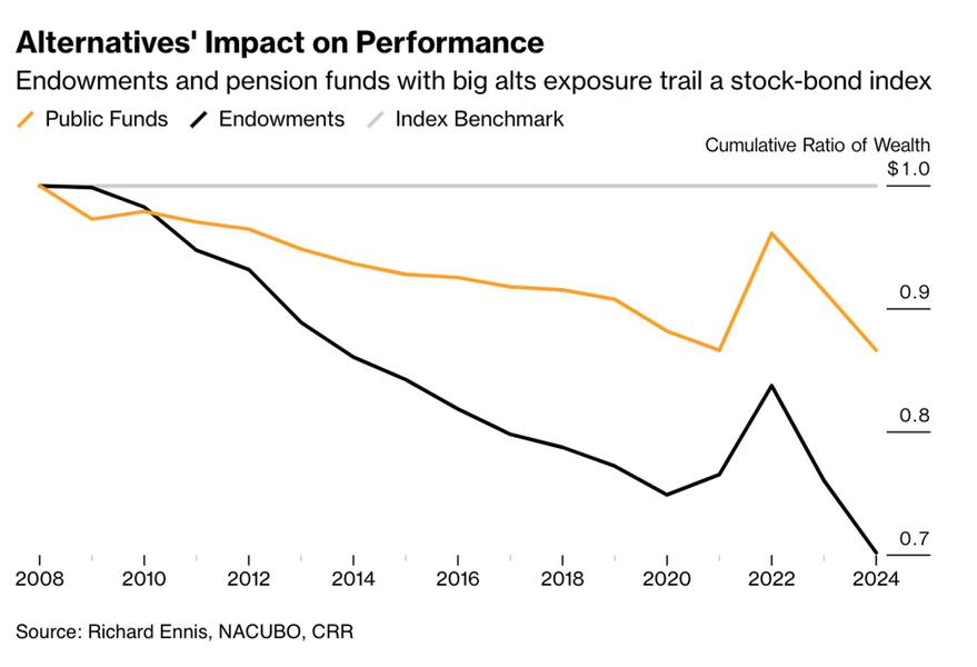 别迷信另类投资了!公开的二级市场就是最好的投资标的。数据现实,大举配置私募股权、对冲基金等另类投资的美国捐赠基金和公共养老基金,其长期投资表现一直逊于传统的“股债组合”指数基准,且差距近年来有不断扩大的趋势。