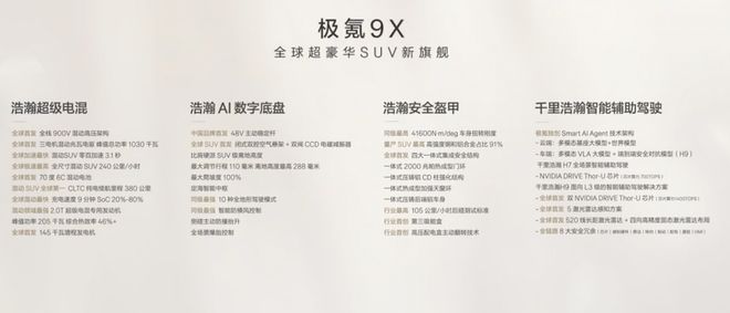 ▲极氪9X搭载极氪超级电混智能化方面,新车搭载千里浩瀚H7或千里浩瀚H9两种方案,前者可实现全场景智能辅助驾驶,后者则是面向 L3 级别的智能辅助驾驶解决方案,采用双NVIDIA DRIVE Thor芯片+五激光雷达,算力达到1400TOPS。