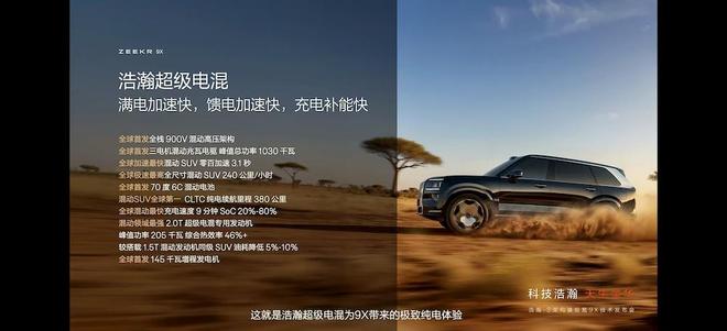 ▲极氪9X搭载浩瀚-S架构40项豪华配置加持下,新车在多个维度表现突出。例如新车首发全栈900V混动高压架构,峰值总功率超1000千瓦,搭载2.0T超级电混专用发动机+145千瓦增程发电机,零百加速仅3.1秒,最高车速可达240公里/小时。