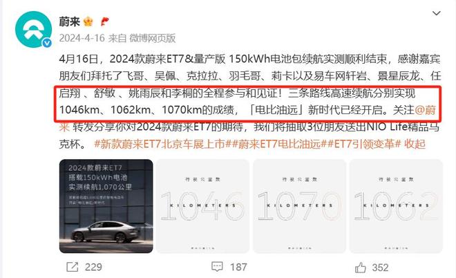 2024年4月,蔚来曾发文表示,2024款蔚来ET7&量产版 150kWh电池包续航实测顺利结束,三条路线高速续航分别实现1046km、1062km、1070km的成绩。