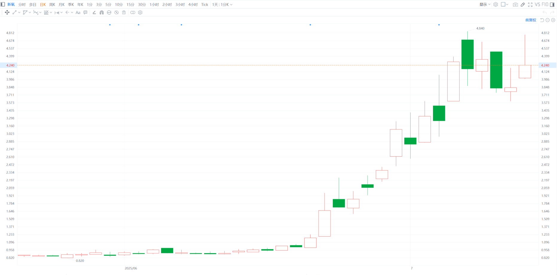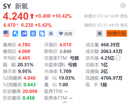 新氧(SY.US)今日盘前续涨5.42%,报4.47美元。该股昨日盘中曾大涨超24%至4.78美元,股价创2021年9月14日以来近4年新高。值得一提的是,新氧的股价自6月下旬起一骑绝尘迅猛拉升,6月份累涨2.6倍,7月以来续涨约37%,年内已飙升约4.3倍。