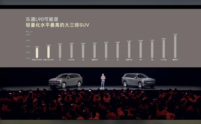 更特别的是,如果不是这场发布会,你都很难意识到一台5145mm长、1998mm宽的三排座全尺寸旗舰纯电SUV,整备质量比宝马X7、奔驰GLS450等传统燃油SUV更小,得房率还更高。