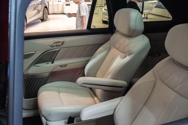 除了坐垫填充比较柔软,三排座椅的靠背还支持38°的电动调节,需要的时候可以让自己的坐姿相对舒展一些,两旁也配备了靠背角度调节和座椅加热开关。对了,前排和二排的门板上均有座椅功能调节,奔驰车主应该会很喜欢。