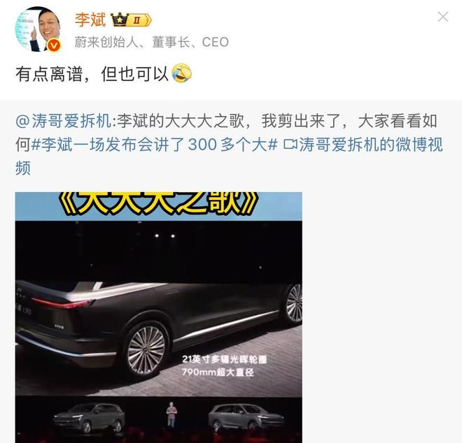 近日有博主将李斌在发布会上的“大”字关键词集合剪辑成了《大大大之歌》,对此李斌回应:有点离谱,但也可以。